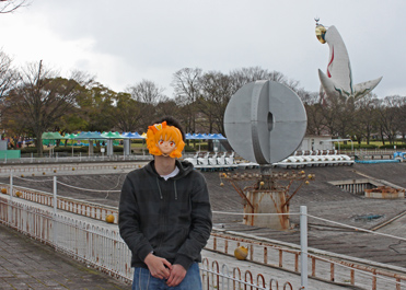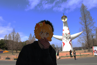 えっと、もともと、太陽の塔とのツーショット写真は俺のmixiの知り合いの方からのリクエストだったため、キュアパインお面を被ってます。